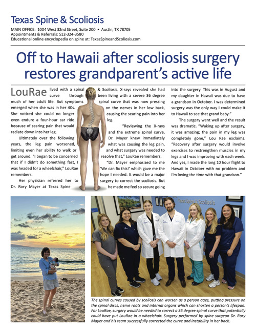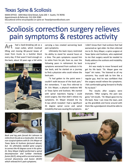 Because of the deformity in my back — I had two 90-degree angles — Dr. Mayer recommended a spinal fusion to straighten my spine as much as possible. He said it would relieve the pain, and he was right. It really did.